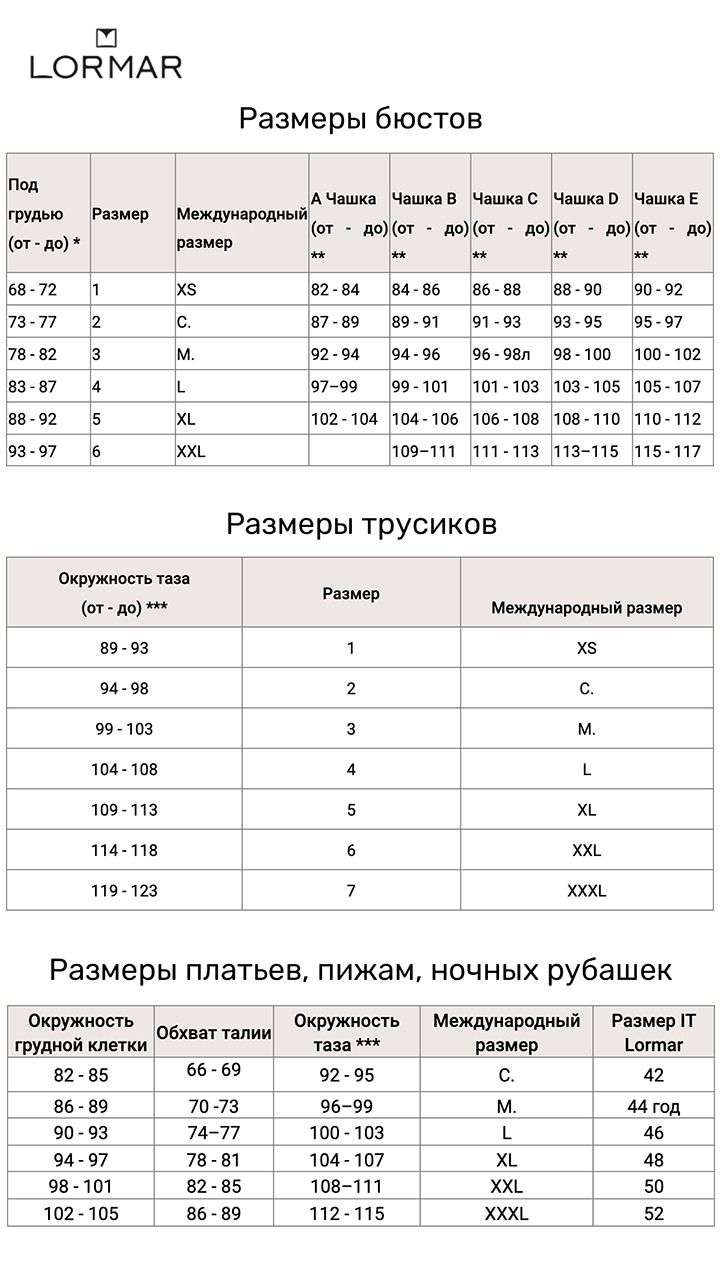 Сантиметровая лента проходит строго горизонтально, параллельно полу по самой выступающей точке груди и лопаткам, прилегает свободно, не стягивая грудь. Измерение снимайте на неглубоком вдохе.3. Посмотрите страну товара и определите свой размер по таблице ниже.