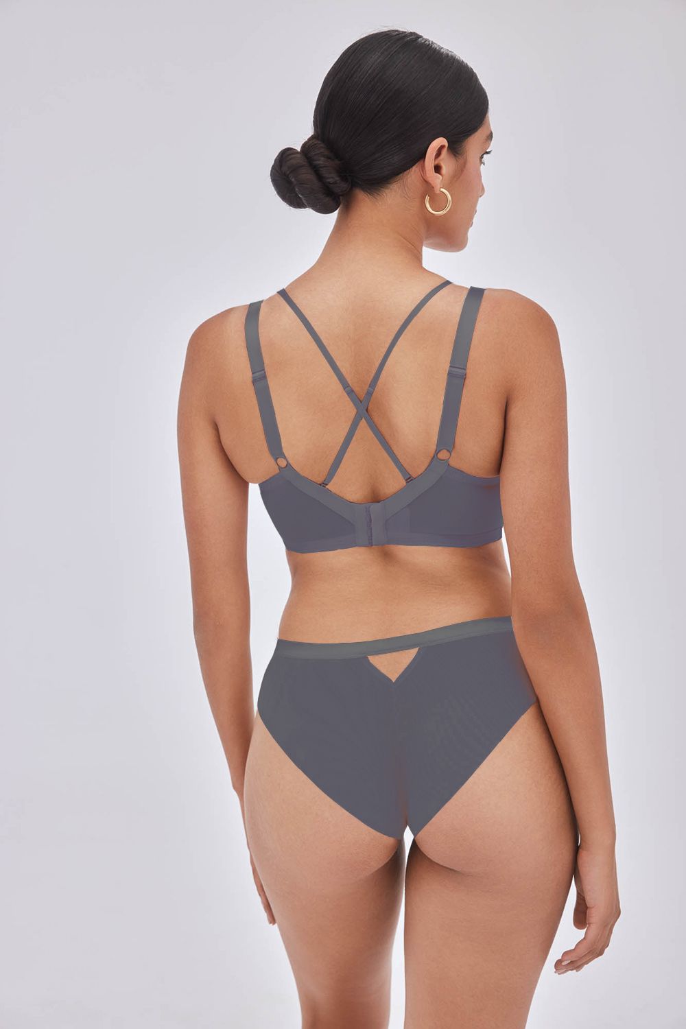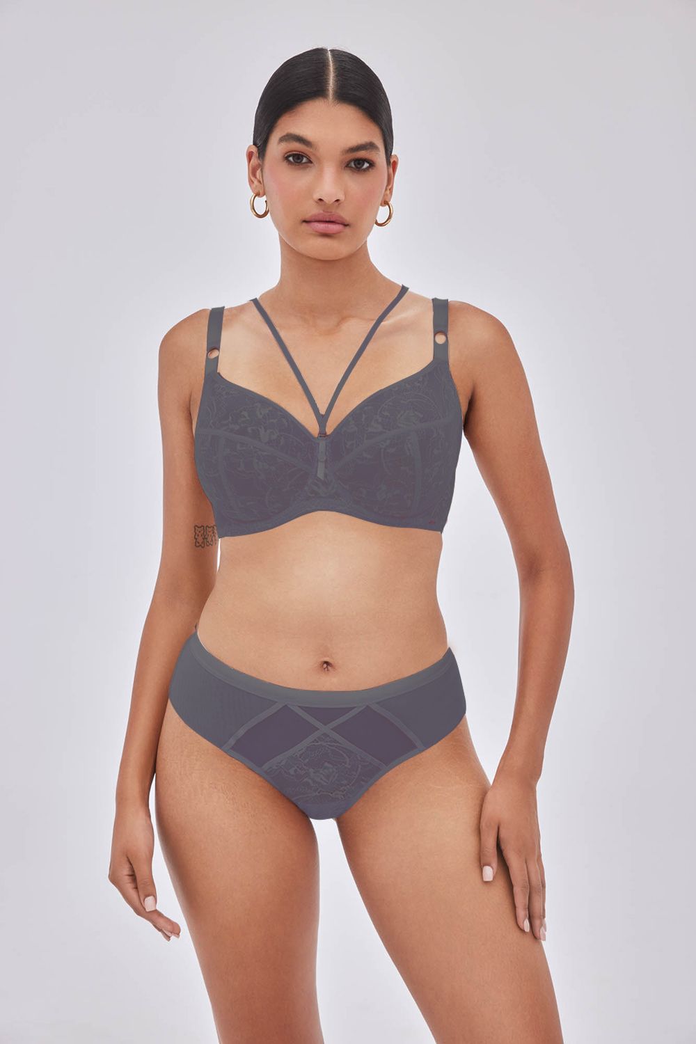 Кружевные трусики-бразилиана Chiara серого цвета. Выполнены из эластичной сетки и ажурного кружева. Ластовица хлопковая.