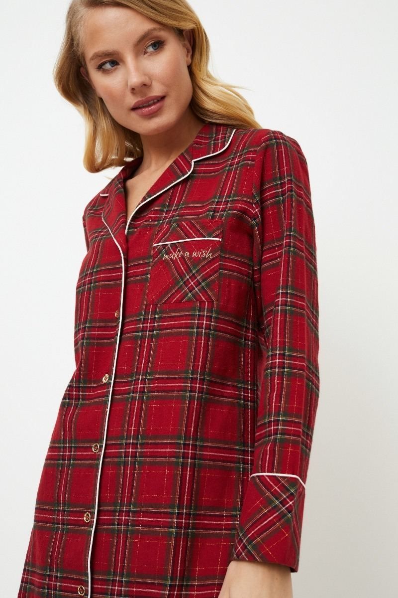 Представляем ночную рубашку Holly, незаменимую вещь на зиму. Платье из мягкого матового хлопка в классическую рождественскую красную клетку. Ночная рубашка с длинными рукавами, застегивающаяся на пуговицы, имеет v-образный вырез горловины и нагрудный карман с золотой вышивкой "Загадай желание" для придания шарма. Воротник, карман и манжеты рукавов отделаны нежным белоснежным кантом. Приготовьтесь к стильному отдыху в ночной рубашке Holly, которая станет вашим идеальным выбором для холодных зимних ночей. И не забудьте, что, пока вы наслаждаетесь уютом своей ночной рубашки Holly, почему бы не подарить своей второй половинке пижаму Hendrix pajama long? Это идеальный способ поделиться теплом и стилем этого сезона вместе. Изделие выполнено из хлопкового фланеля.