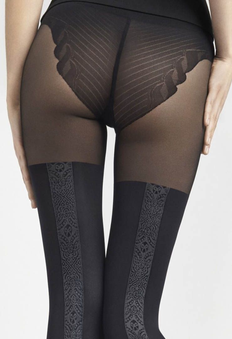 Плотные колготки с имитацией чулка Marilyn ZAZU J01 с ажурными трусиками, выполнены из микрофибры плетением 3D. Приятны к телу. По ноге сзади широкая полоска с ажурным рисунком.