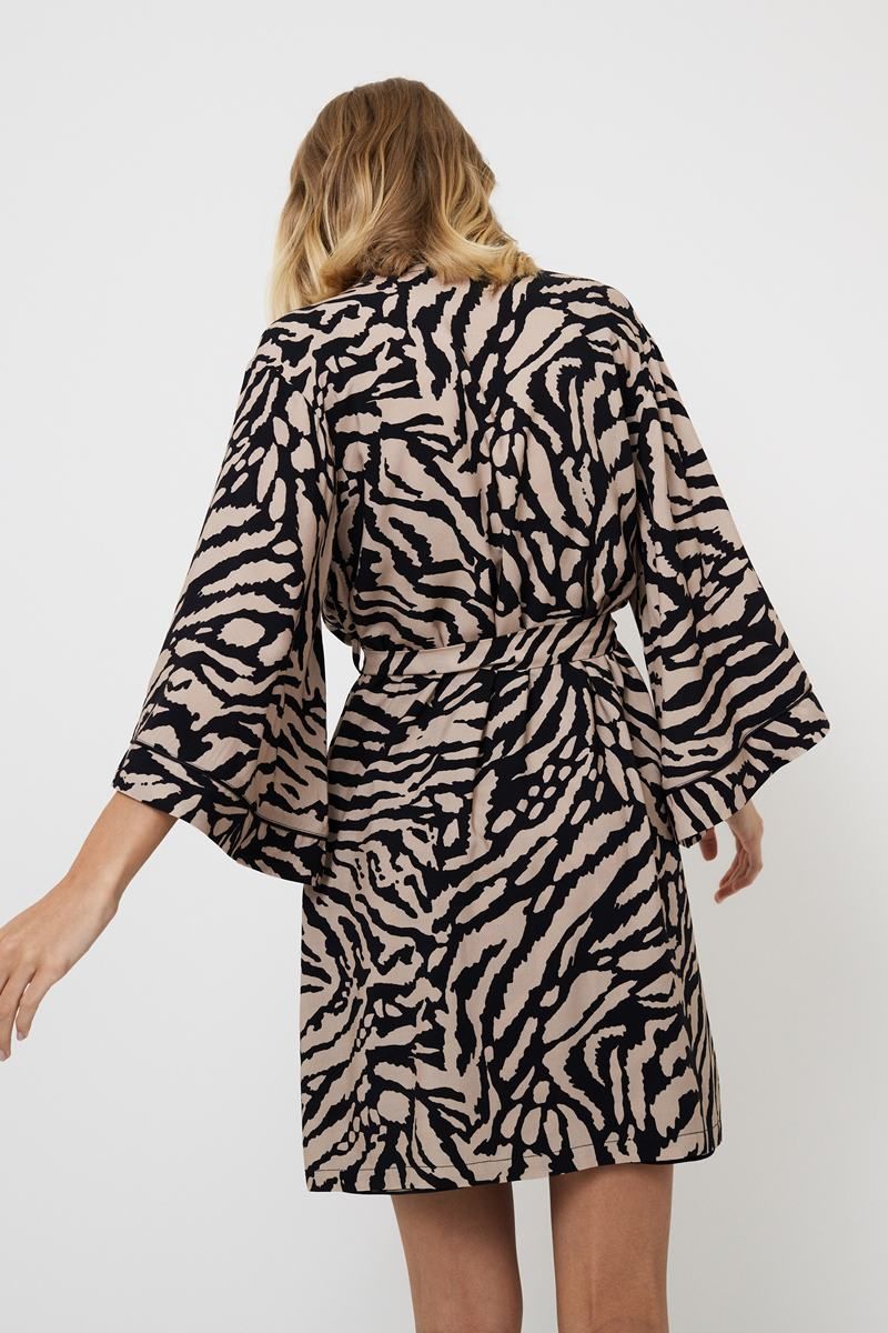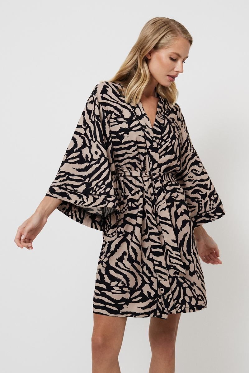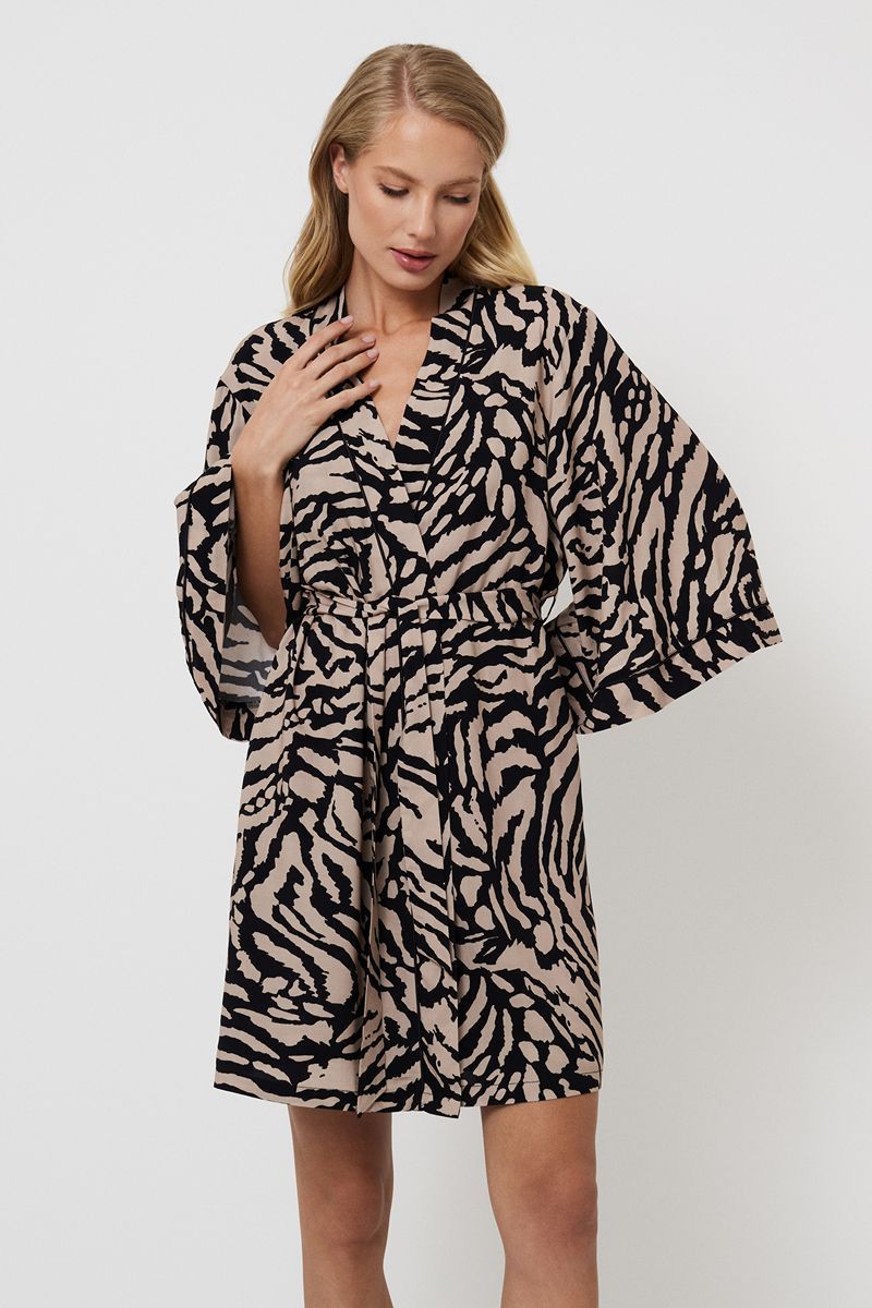 Представляем вам халат Sherry — божественное воплощение комфорта и элегантности. Этот халат из лёгкой вискозы с тигровым принтом, которое нежно ласкает кожу. Окунитесь в атмосферу изысканности благодаря его свободному силуэту с широкими рукавами, напоминающему лёгкий ветерок летним вечером. Пояс не только подчёркивает вашу фигуру, но и придаёт вашему образу царственную грацию. Украшено замысловатой чёрной окантовкой по вороту и манжетам рукавов. Независимо от того, отдыхаете ли вы дома или готовитесь к особому случаю, пусть халат Sherry станет для вас символом непринуждённой элегантности и изысканного вкуса.