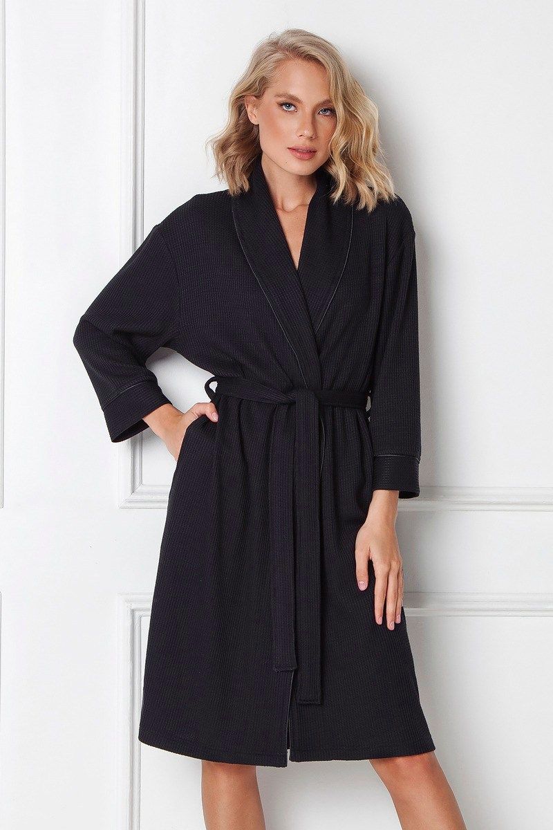 Элегантный халат ANNALISE с карманами по бокам, атласными шнурами внутри и поясом. Манжеты и воротник украшены атласной окантовкой. Этот красивый халат сделан из вязаной ткани и предназначен для того, чтобы побаловать себя.