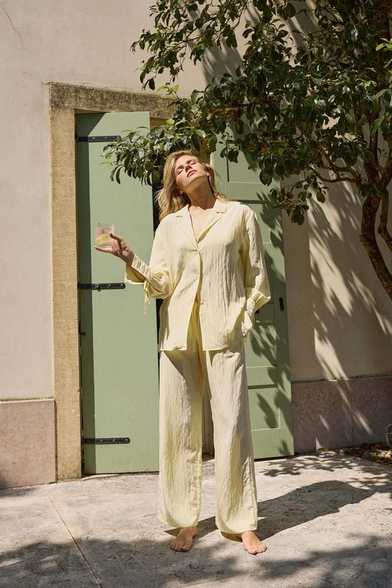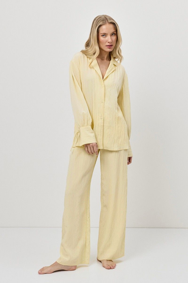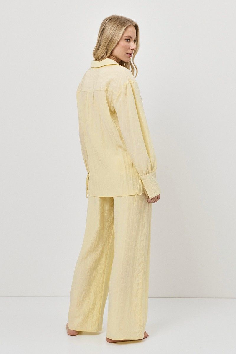 Комплект женский со штанами SOLARA. Выполнен из креп-вискозы с добавлением нейлона. Легкая ткань с жатым эффектом, придающая ощущение воздушности. Рубашка на пуговицах с отложным воротником, длинные рукава с завязками. Штаны свободного кроя с поясом на эластичной резинке с кулиской и боковыми карманами. Подходит для отдыха дома и прогулок на пляже.