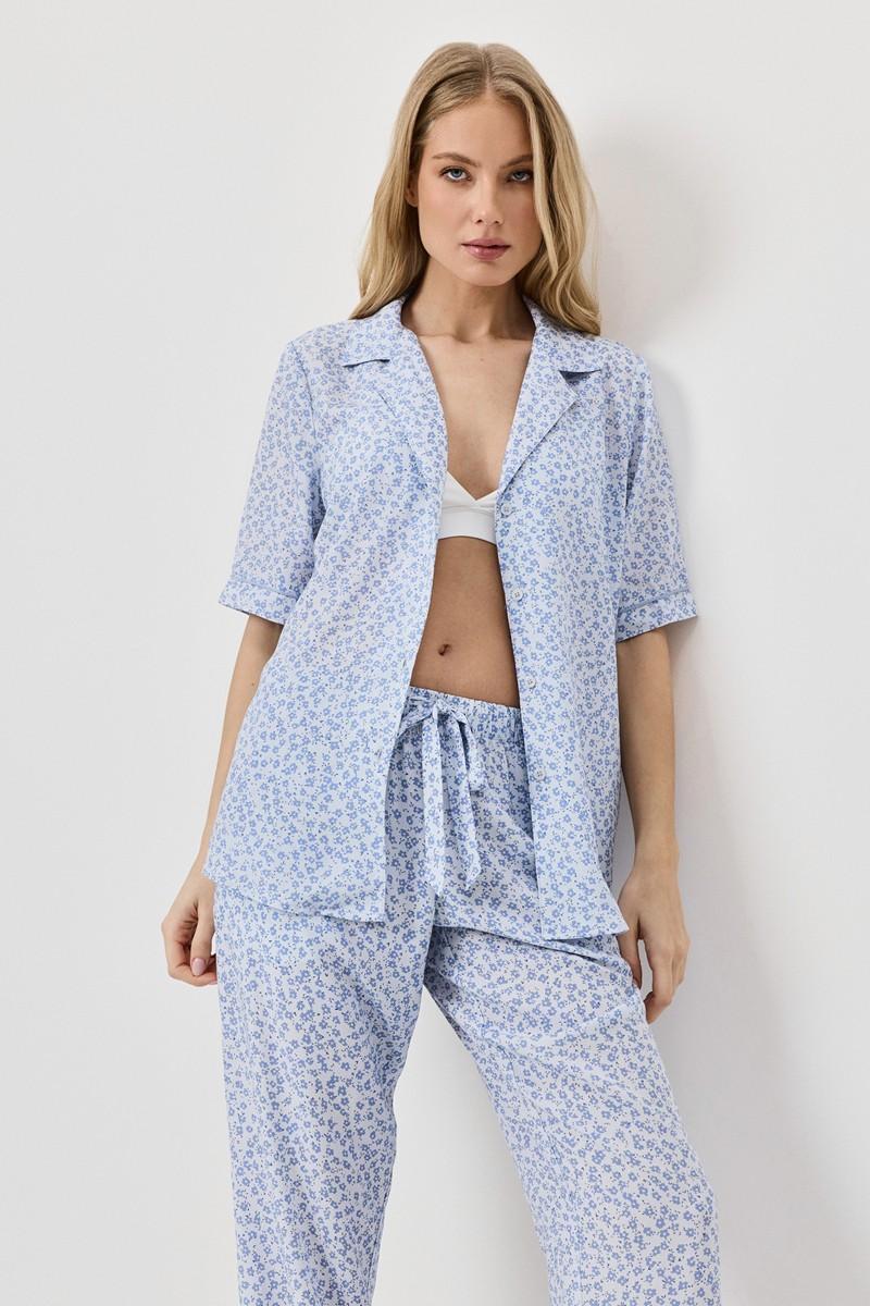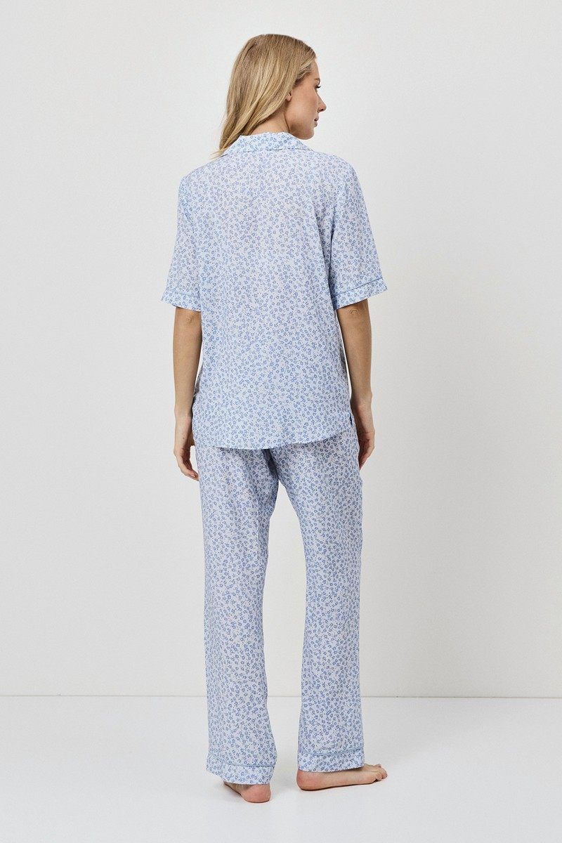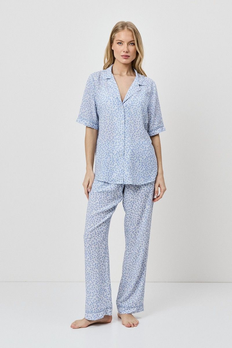 Пижама женская со штанами LULLABY для вашего ночного комфорта. Пижама выполнена из вискозы. Рубашка на пуговицах, с короткими рукавами и отложным воротником. Окантовка украшает изделие. Штаны прямого кроя, эластичный пояс с кулиской, по бокам карманы. Расслабьтесь с максимальным комфортом и стилем в пижаме LULLABY.