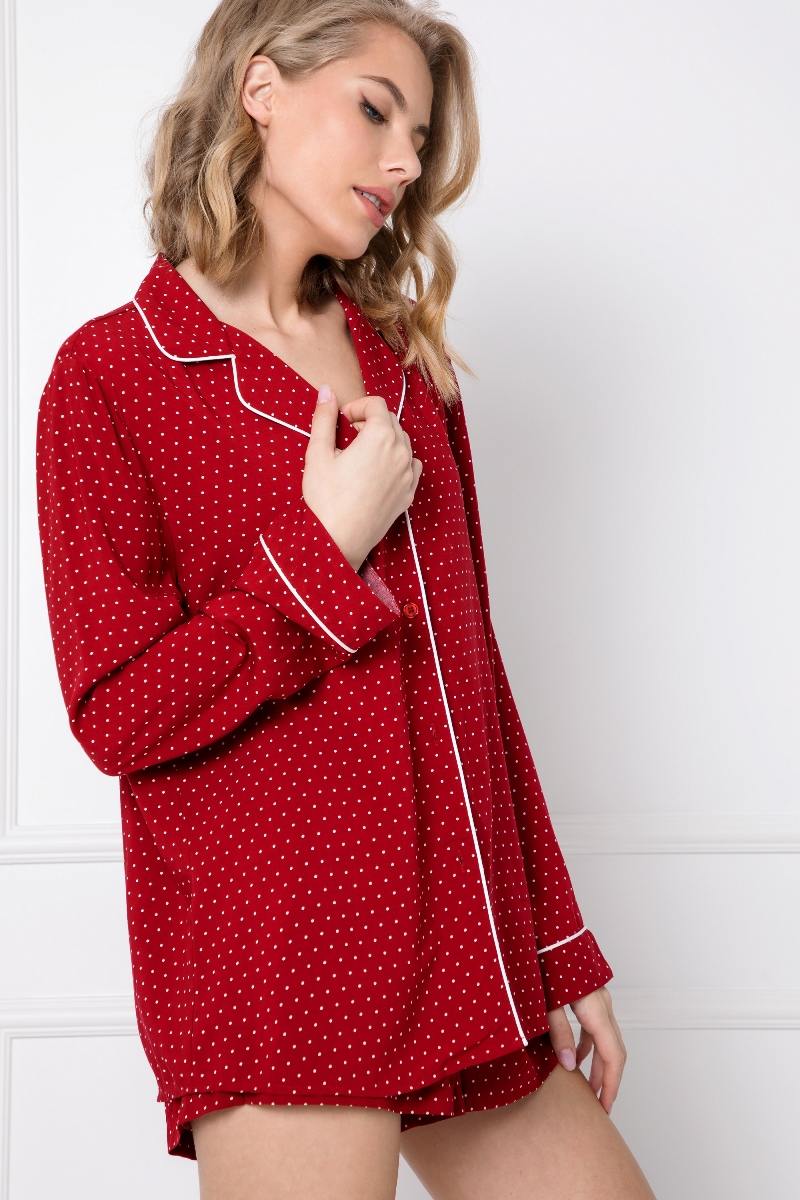 Элегантная и особенная пижама рубашечного типа Michaela из шелковой вискозы. Воротник пижамы украшен атласной окантовкой, a рукава декорированы кружевом. Шорты с эластичной резинкой на поясе. Узор ткани - мелкие белые точки.