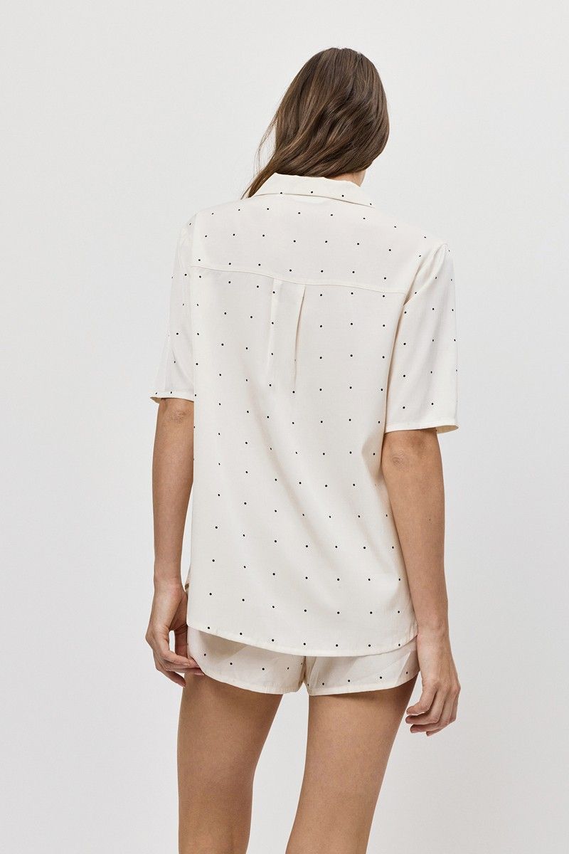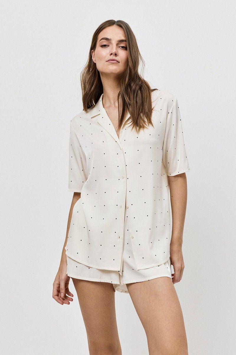 Побалуйте себя роскошной гладкостью пижамы ALBA. Пижама женская с шортами. Рубашка на пуговицах, с короткими рукавами. Короткие шорты с поясом на эластичной резинке. Выполнена из шелковистой атласной вискозы. Принт мелкий горошек.